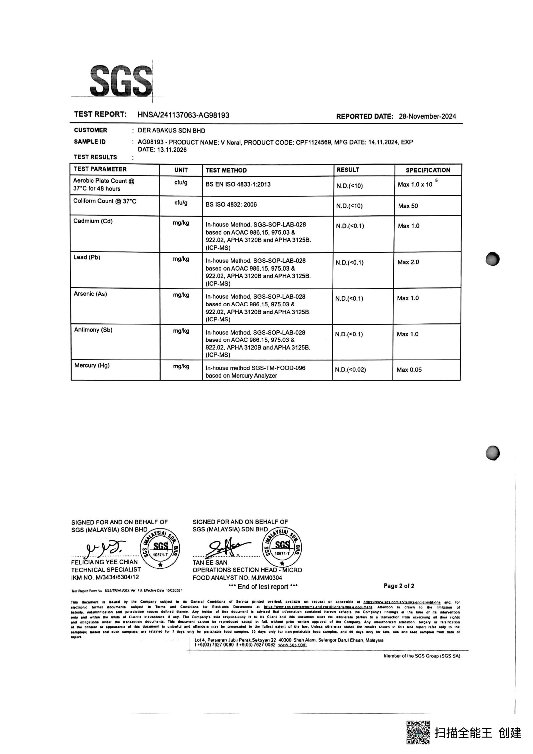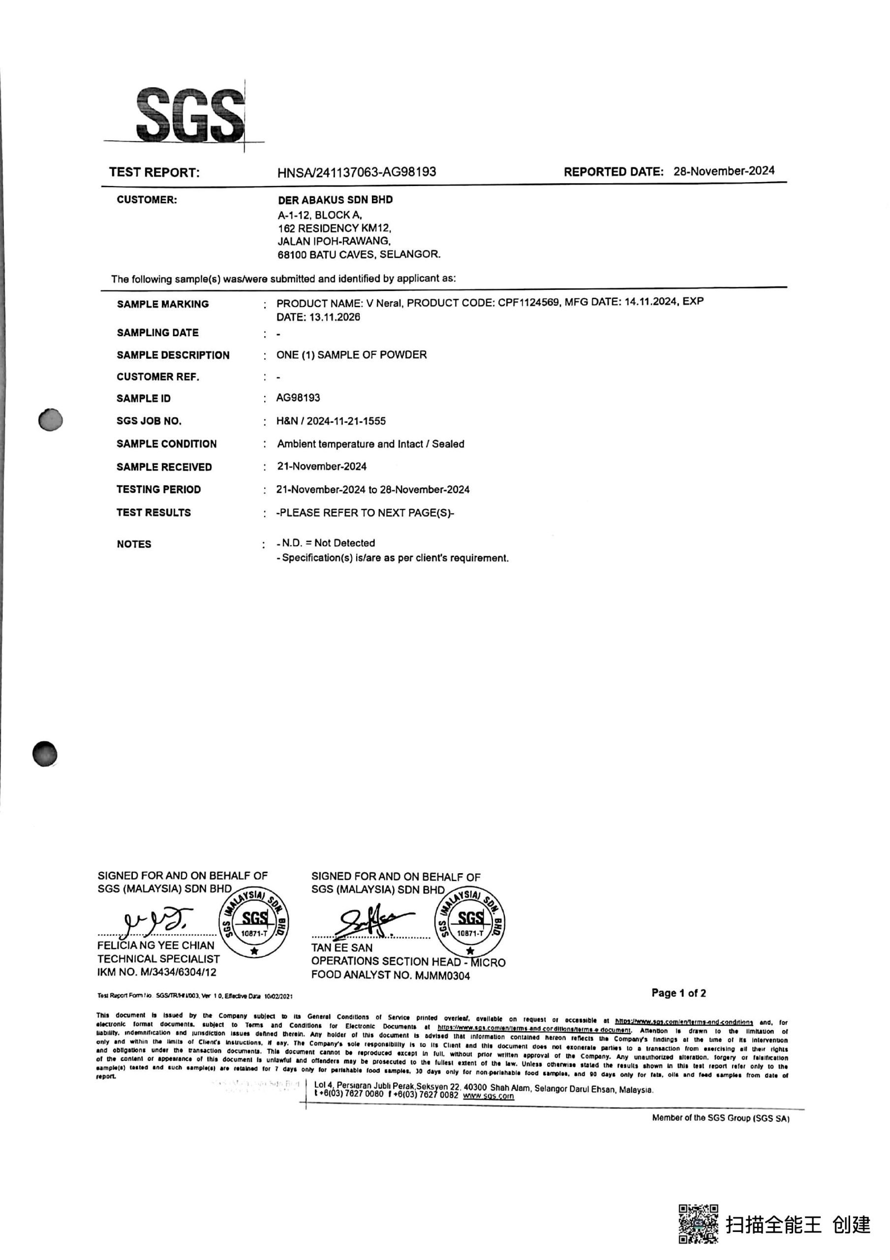 A proprietary blend of star ingredients—calcium carbonate, calcium lactate, magnesium carbonate, magnesium citrate, potassium chloride, zinc gluconate, selenium, hydrolyzed collagen peptide, lutein—and more. V NERAL works to replenish your body with the ammo it needs to minimise aging-degeneration.